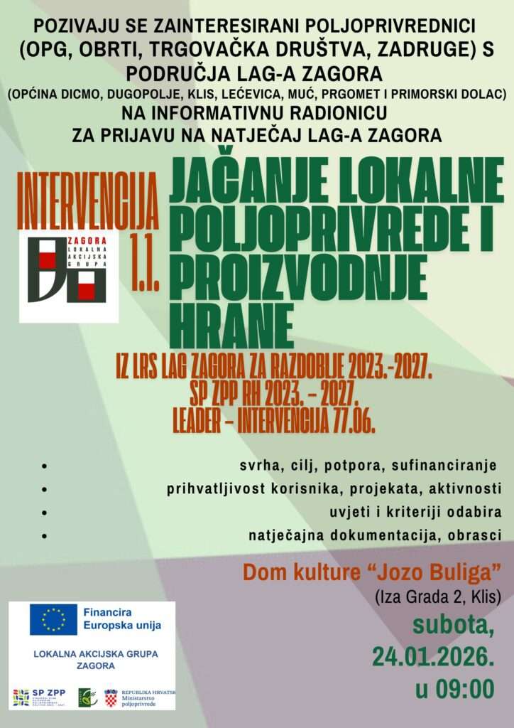Pozivamo sve zainteresirane poljoprivrednike, proizvođače hrane, poduzetnike i ostale potencijalne prijavitelje da nam se pridruže na informativnoj radionici na kojoj će biti predstavljeni uvjeti natječaja, prihvatljivi korisnici i aktivnosti te postupak prijave u subotu, 24. siječnja 2026. godine u Domu kulture Jozo Buliga u Klisu s početkom u 9 sati.
